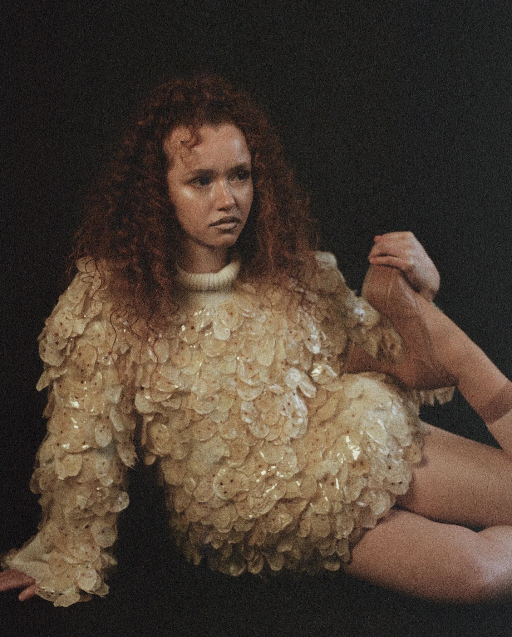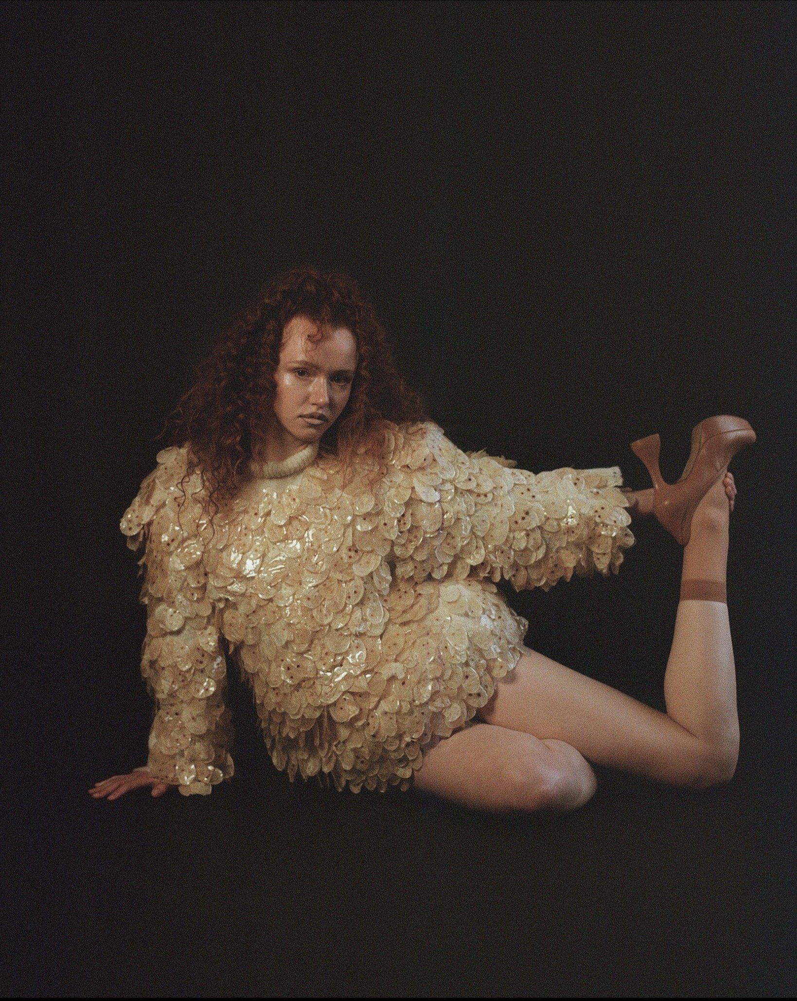 Look 2 merges a sculpted chestplate corset by @cameronhancock.studio with the deconstructed layering of a @diesel mini skirt. Vintage @dior boots from Fall 2011 — featuring crocodile trim, harness details, and corset lacing — sourced by @elishascloset_, paired with floral 3D-printed jewellery by @ivyjstudio which together intensify the juxtaposition between armor and sensuality